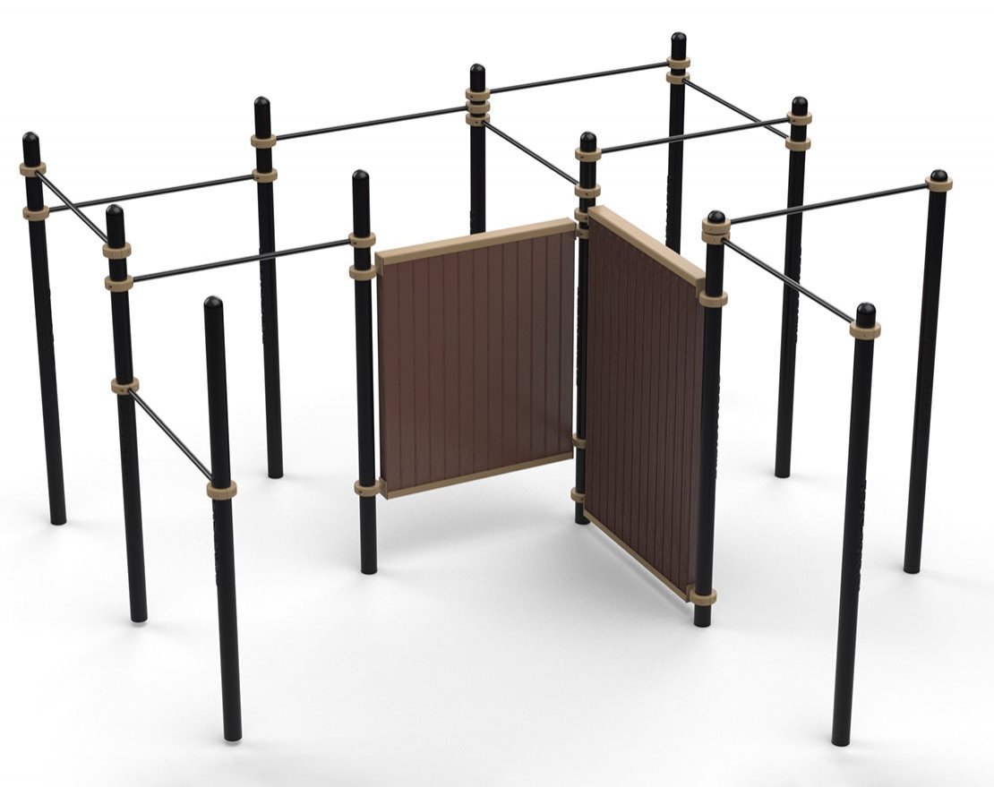 Данная конструкция состоит и 12 столбов, 11 перекладин и двойной стены. Комплекс предназначен для базовых подтягиваний, а также для выполнения разнообразных фристайл-элементов для любителей и продвинутых паркурщиков.