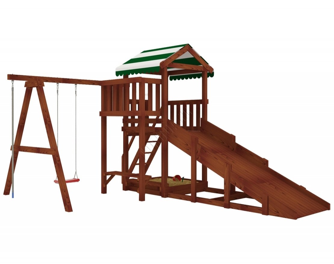 «Савушка мастер 1» — всепогодная модульная конструкция, которая позволяет нескольким детям одновременно играть на одной площадке. В основе конструкции — игровая башня с ярким пластиковым скатом и балкончиком. Дети могут забираться на башню по деревянной лестнице или скалодрому с пластиковыми зацепами. Также в модели предусмотрен дополнительный канат, расположенный слева от качели. Для спокойных игр есть песочница с лавочкой.