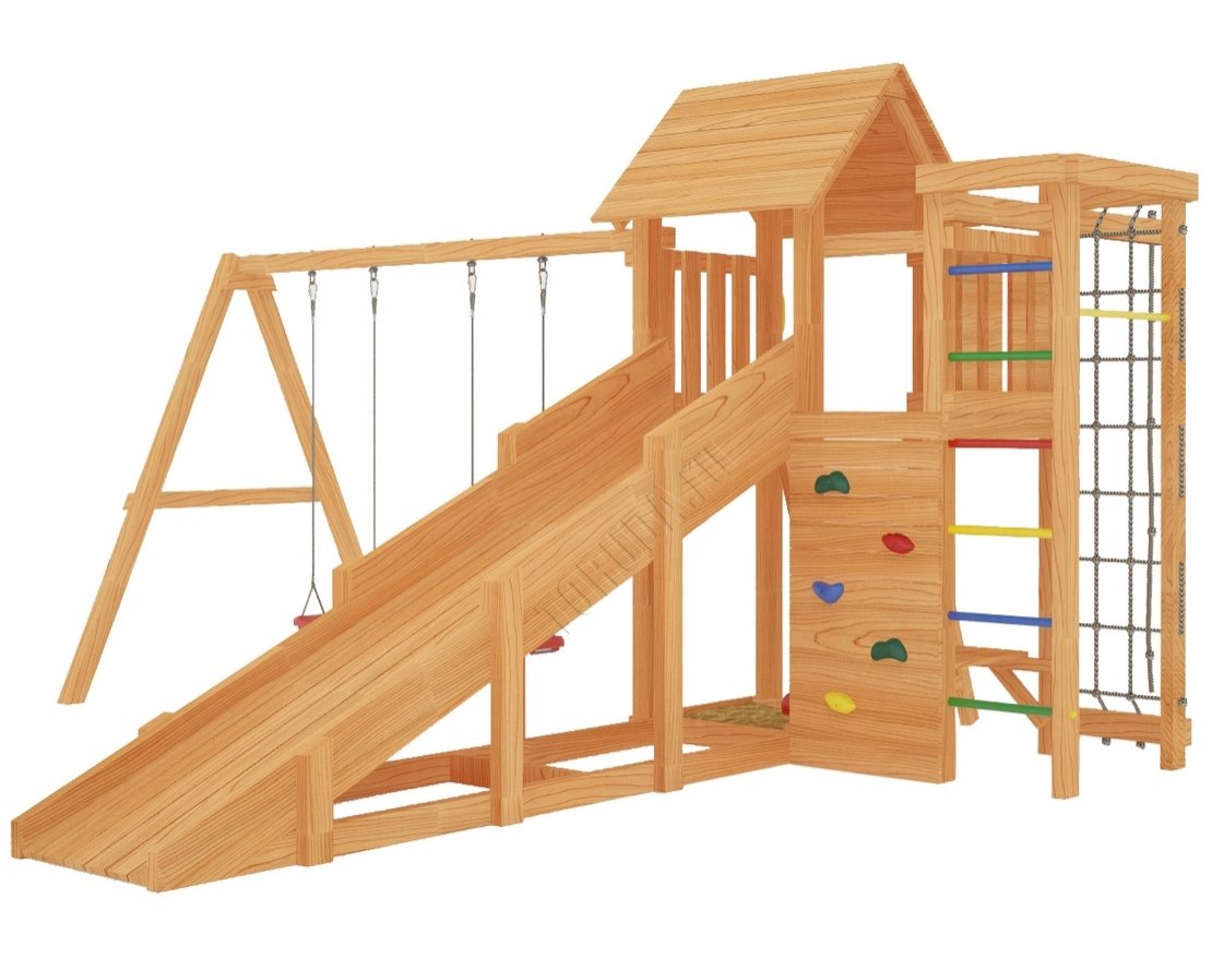- Безопасность. Конструкция комплекса соответствует ГОСТ, изготовлена из экологичного клеёного бруса, а подвижные элементы — из металла. Все детали отшлифованные и закруглённые, что исключает риск получения травм.