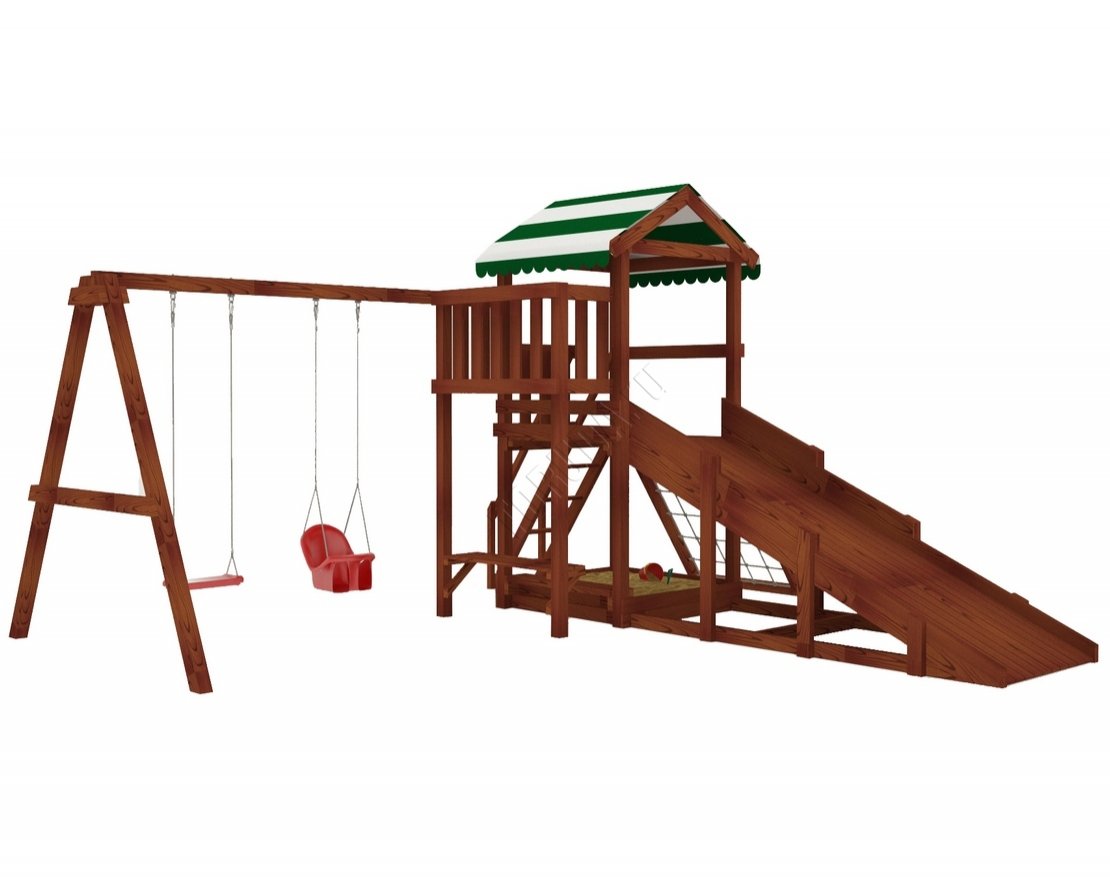 Площадка соответствует ГОСТ 52169–2012, а все детали выполнены из клеёного бруса 7,5 см х 7,5см и массива сосны 9 см х 4,5 см. Для установки рекомендуется использовать анкера (в комплект не входят), чтобы надёжно закрепить конструкцию.