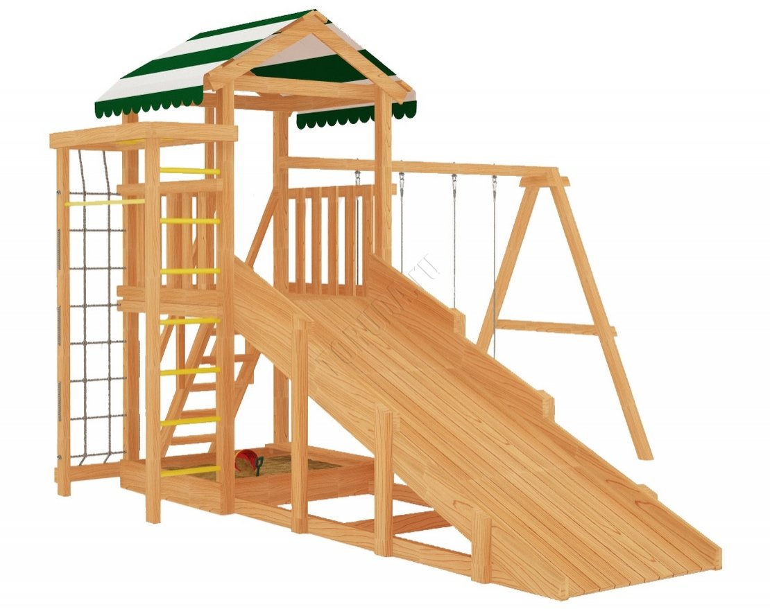 В комплект входят: горка, игровая башня, качели, лекало, лестница, песочница с лавочкой, рукоход, сетка-лазалка и другие элементы.