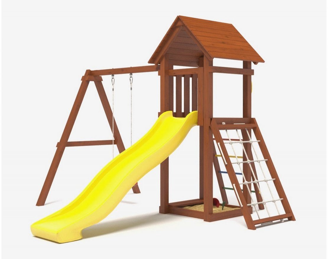 - Универсальность: комплекс включает разнообразные элементы, которые понравятся детям разных возрастов: песочницу, горку, качели, домик и сетку-лазалку.