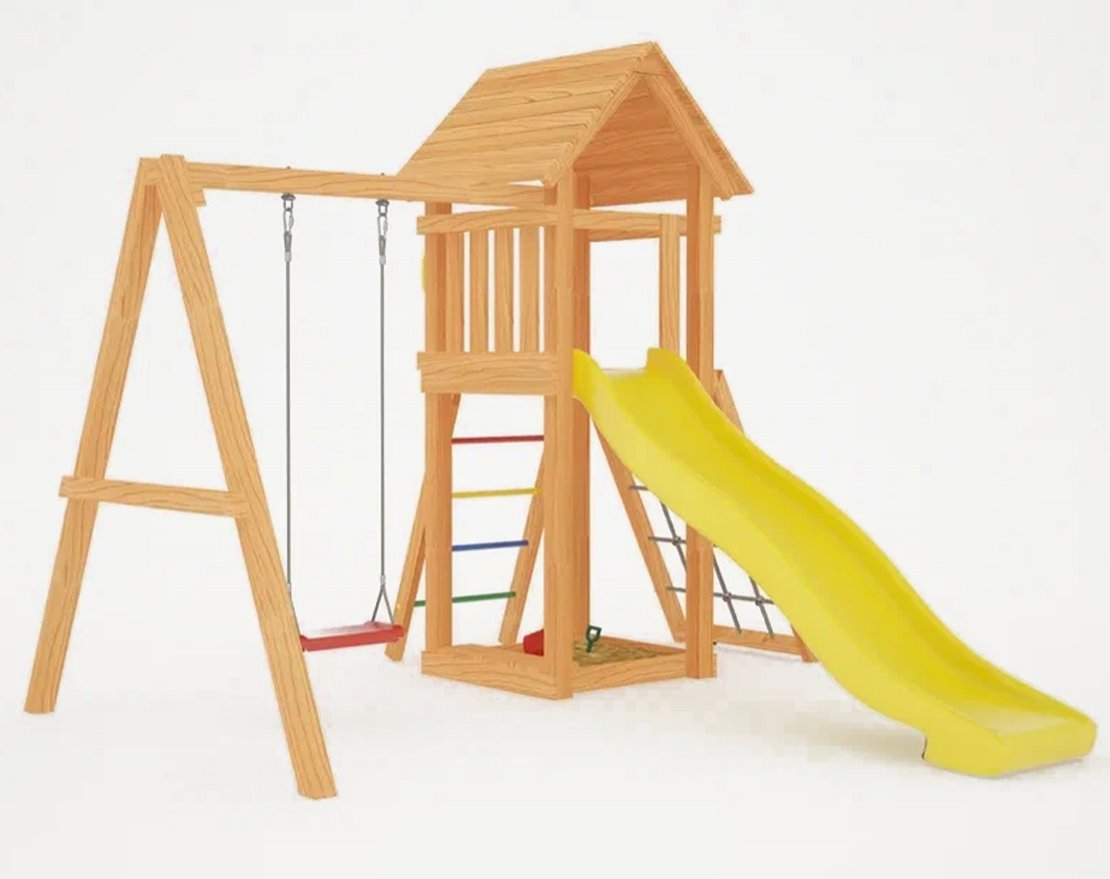 Эта площадка предназначена для установки на детской площадке или в саду. Она изготовлена из качественных материалов и соответствует ГОСТ 52169–2012. Детали площадки — из клеёного бруса сечением 75х75 мм, они отшлифованы и закруглены по радиусу 5 мм для безопасности детей.