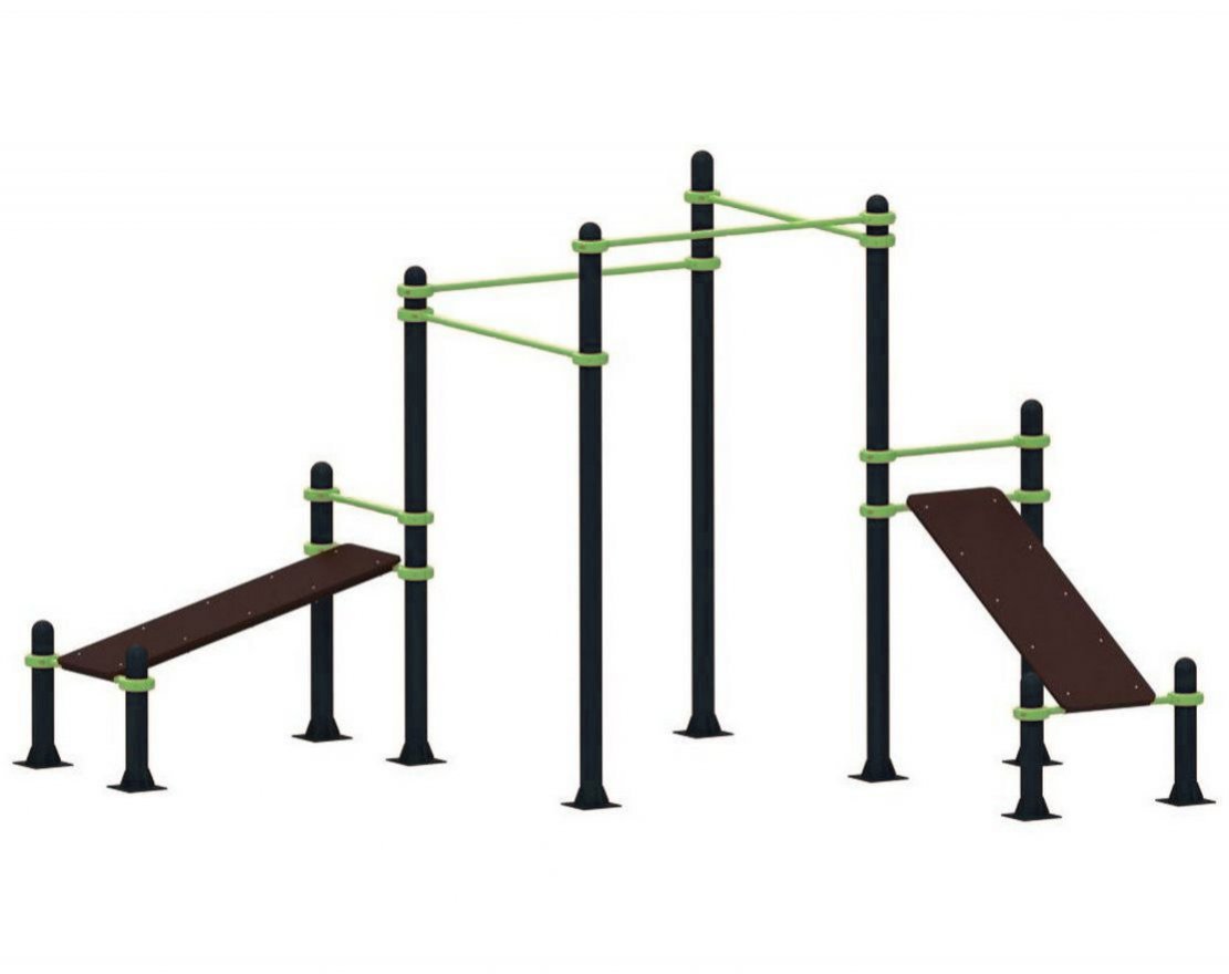 Комплекс состоит из различных турников на разной высоте и двух спортивных скамей для пресса. Он подходит для установки в школах, во дворах, скверах и парках.
