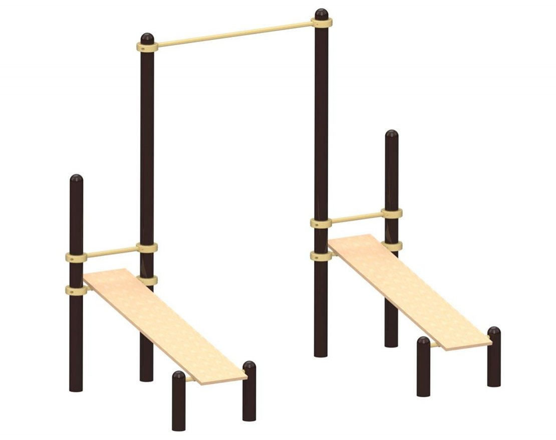 Спортивный комплекс, предназначенный для общефизической подготовки, разработан для развития мышц пресса, рук и плеч, укрепления позвоночника. Он подходит как для индивидуальных занятий, так и для использования в составе спортивных площадок во дворах, школах и на частных территориях. Изделия изготовлены из стали и обладают высокой прочностью, а все элементы регулируются по высоте с помощью специальных хомутов.