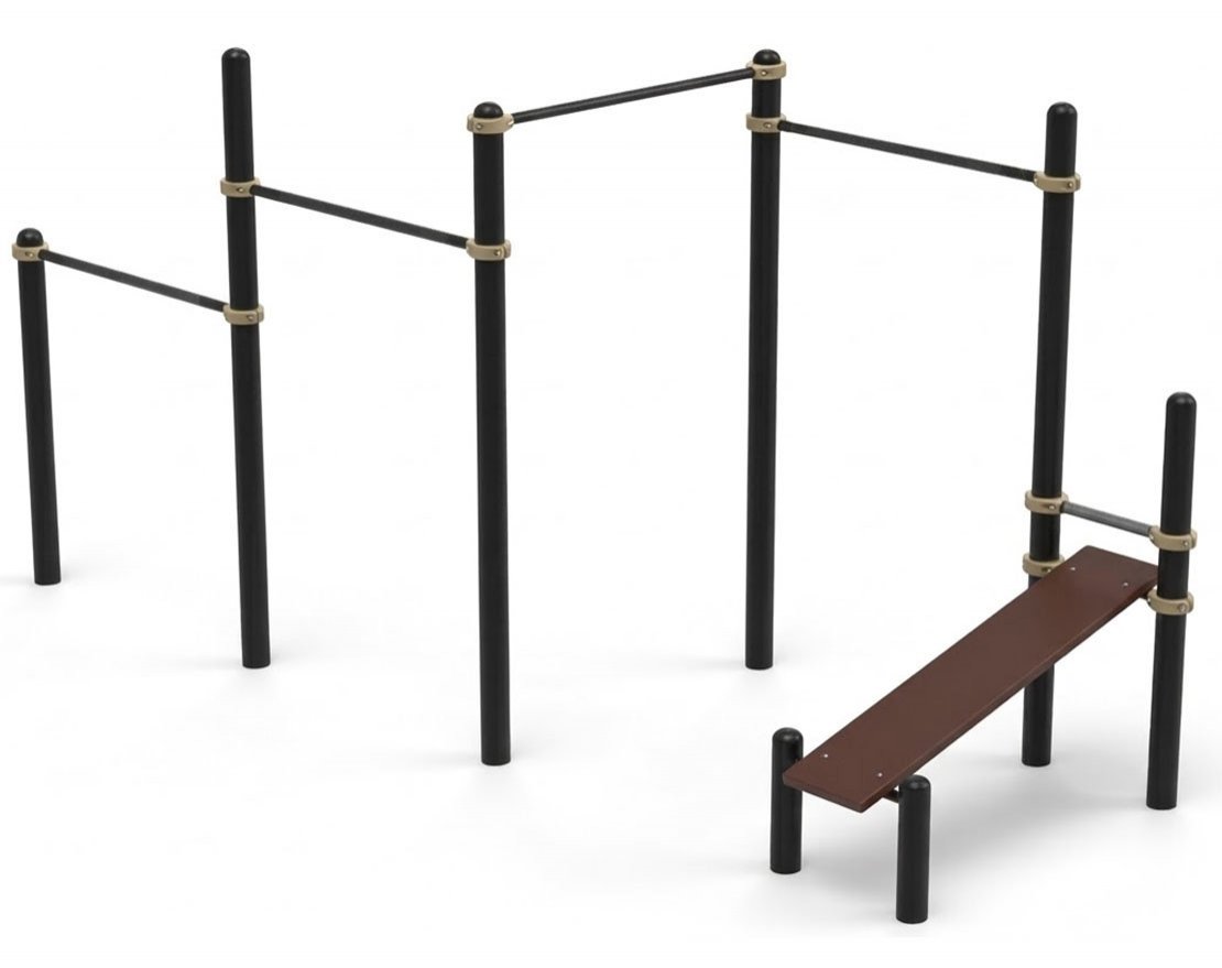 Комплекс представляет собой набор из двух элементов, которые можно использовать как вместе, так и по отдельности. Он включает в себя уличный турник и скамью для пресса.